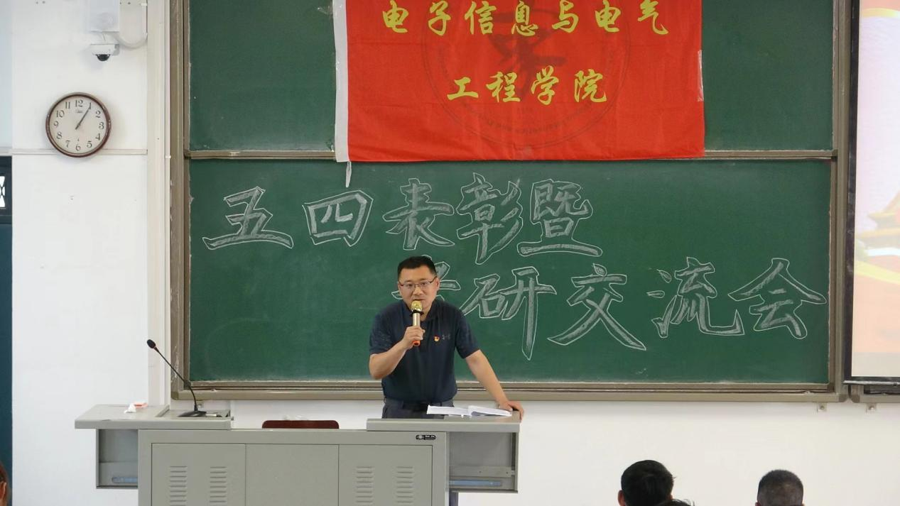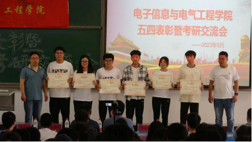 为更好的鼓舞同学们,表彰为学院工作做出贡献的优秀青年学生,电气学院于5月31日在A19-203举办了“2023年五四表彰大会暨考研交流会”。参会人员有党总支副书记张涵、团总支书记申庆超、各专业辅导员老师、考研优秀学生代表、2020级、2021级和2022级优秀学生代表,共计200余人。