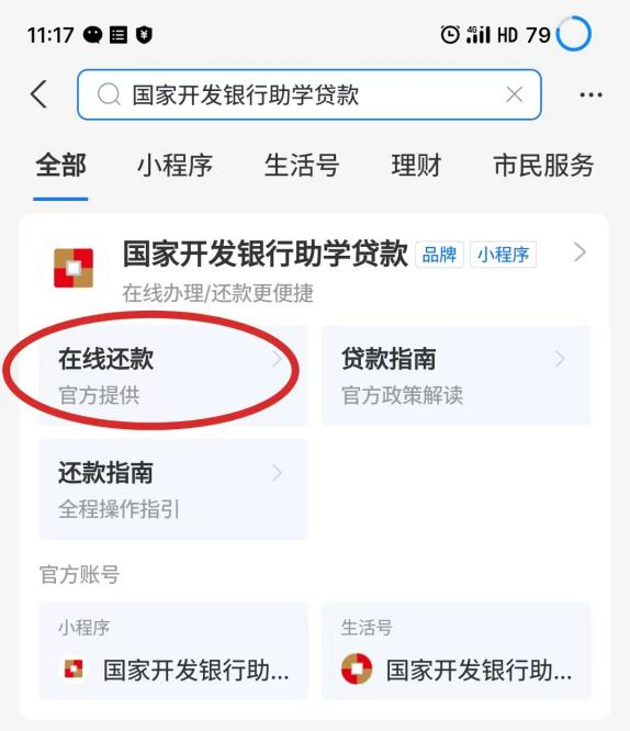 1.支付宝搜索国家开发银行助学贷款小程序,选择在线还款: