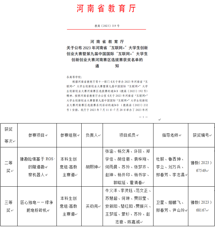 近日,2023年河南省“互联网+”大学生创新创业大赛暨第九届中国国际“互联网+”大学生创新创业大赛河南赛区选拔赛获奖名单公布,我院在本届大赛中获得优异成绩,由杜毅、卫星等老师指导的学生团队分别获得高教主赛道本科生创意组二等奖、三等奖。