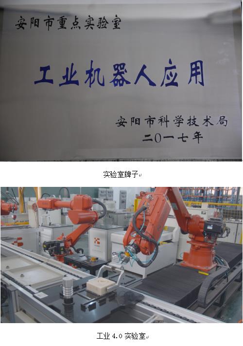 安阳市工业机器人应用重点实验室2017年12月经安阳市科学技术局批准成立,以安阳工学院电子信息与电气工程学院为依托建设。实验室围绕国家、省市发展规划,以推进传统装备制造向智能化转型、推进工业机器人应用为宗旨,为智能制造技术的科学研究和工程训练提供一个先进的、具备实际生产能力的工程实践平台,进而推进传统装备制造向智能化、集成化、精密化转型,促进科学研究、技术开发、成果转化和产业化等方面协调发展。