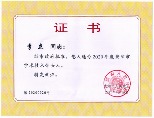 近日,安阳市人民政府发文,公布了2020年安阳市学术技术带头人评选结果。我院教师李立当选为2020年安阳市学术技术带头人。这是我院人才队伍建设取得的新进展。