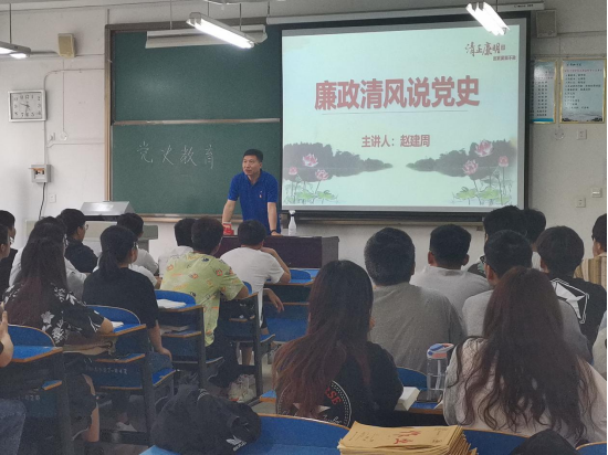 为使师生了解党的发展历程,培养大家勤俭节约,廉洁奉公的精神,电气学院院长赵建周于5月13日上午在A07-206教室向学院师生讲述以“廉政清风说党史”为主题的党课。