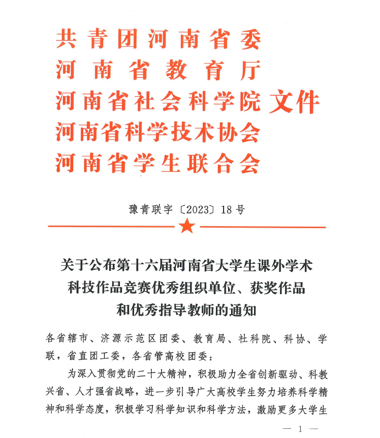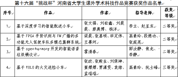 近日,由共青团河南省委、河南省教育厅、河南省科学技术协会、河南省社会科学院、河南省学生联合会共同举办的第十六届“挑战杯”河南省大学生课外学术科技作品竞赛获奖名单公布,在学院的高度重视和精心组织安排下,我院在本届竞赛中获得优异成绩,由李立、高素玲、郭汝静等老师指导的学生团队获得二等奖3项,三等奖1项。
