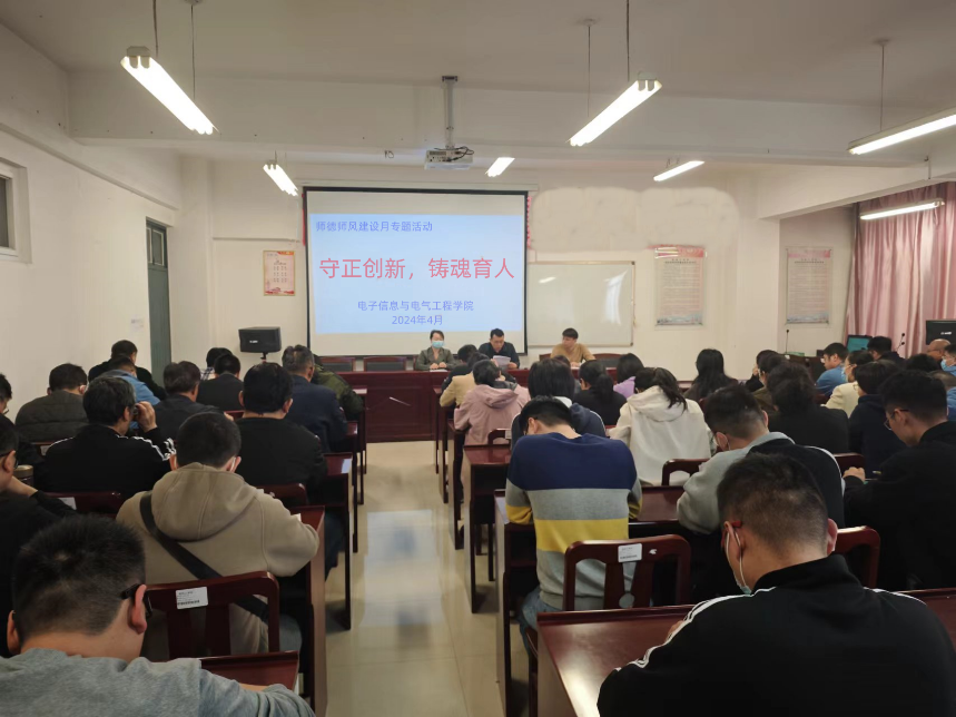 为进一步全面贯彻党的教育方针,强化师德师风建设,4月10日下午,电气学院在A-07 311会议室开展了以“守正创新,铸魂育人”为主题的师德师风建设专题活动启动会。会议由学院党总支书记董昭主持,学院领导班子和全体教师参加。